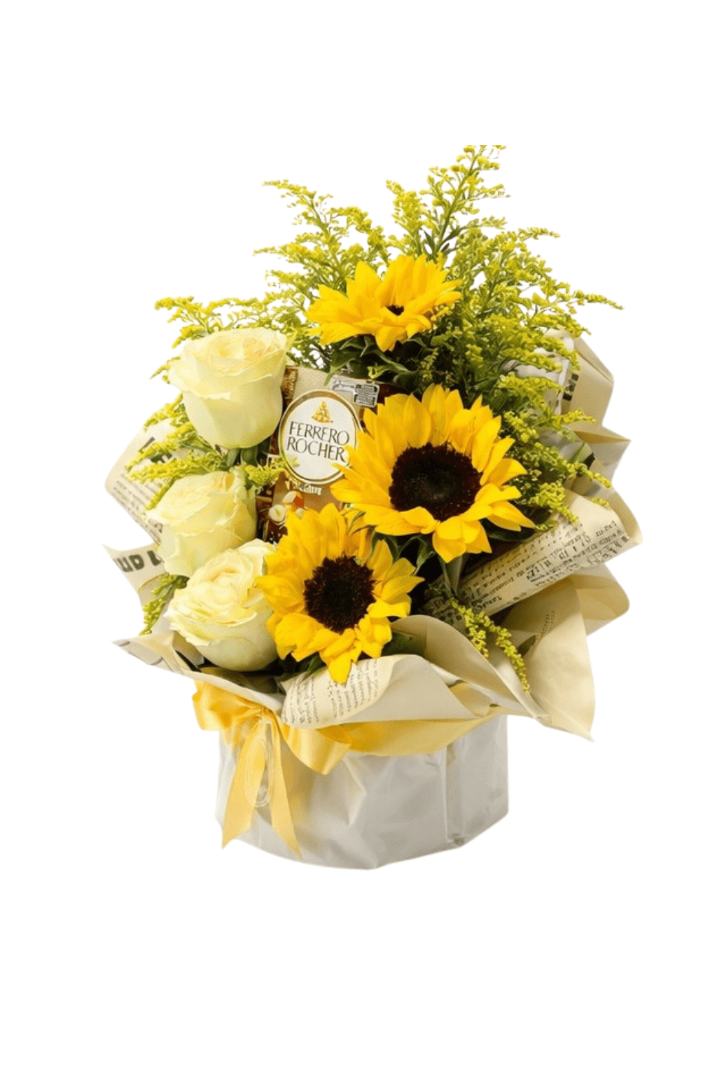 O Arranjo com Girassois é como um abraço caloroso em um dia ensolarado, perfeito para iluminar sorrisos e aquecer corações. Imagine entregar àquela pessoa especial um arranjo vibrante com girassóis, rosas naturais cheias de delicadeza, e uma barra de chocolate Ferrero que derrete no paladar. Ela vai amar!