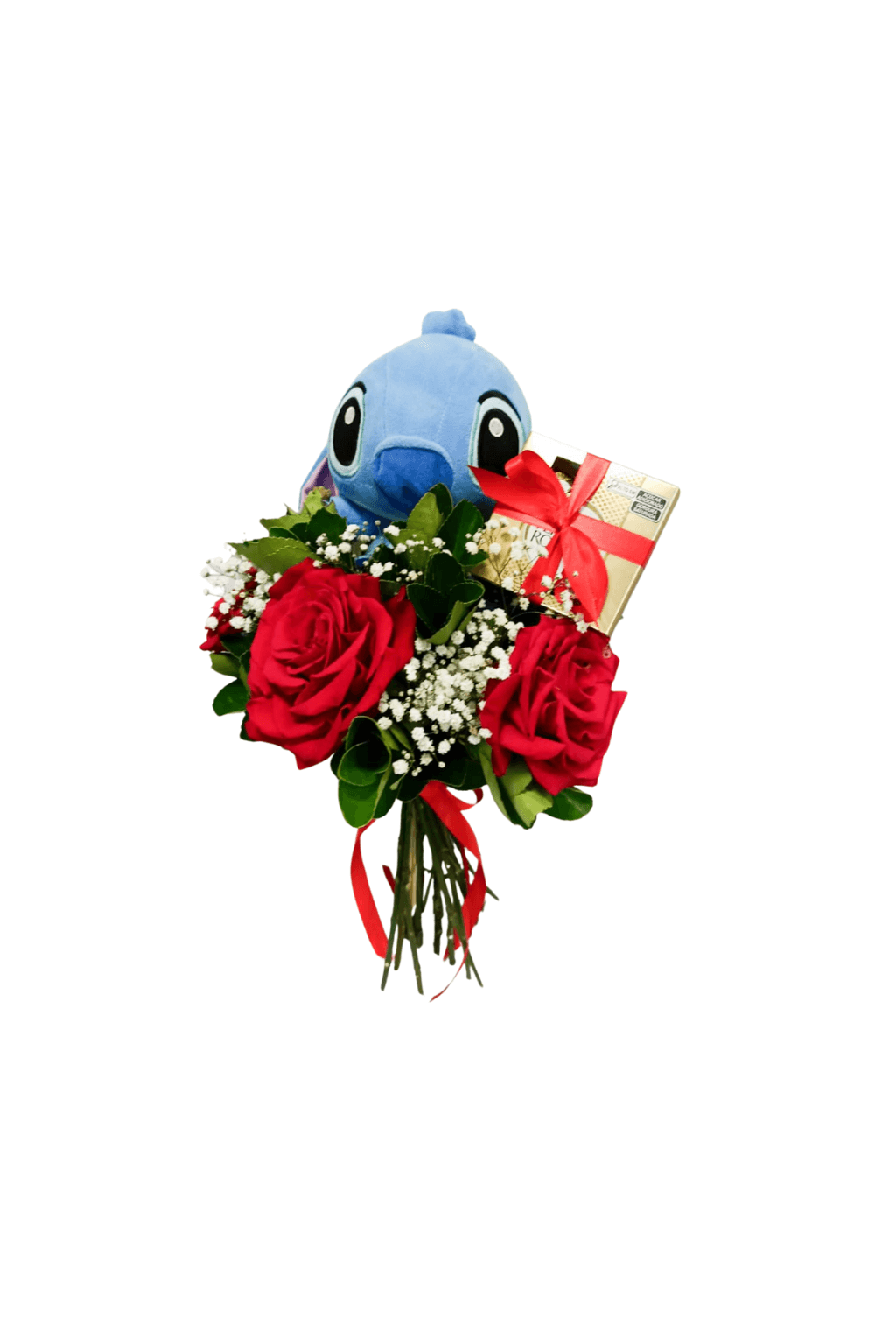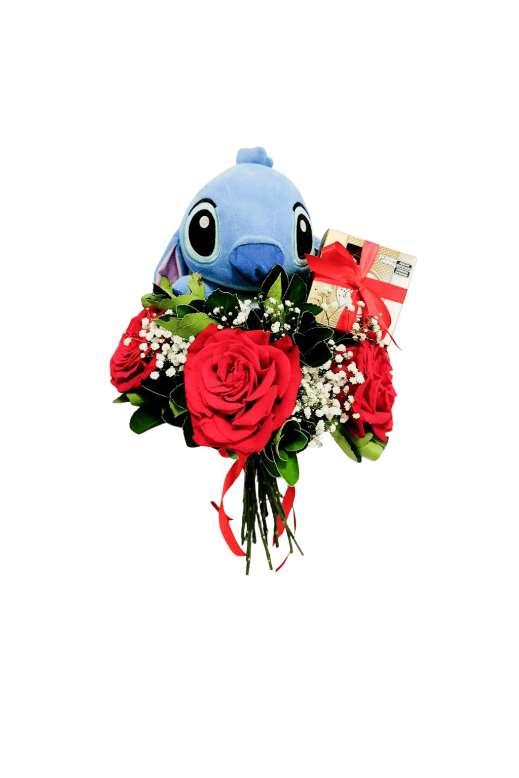 Esse Arranjo de Rosas vermelhas com Stitch é a escolha ideal para surpreender com carinho e delicadeza das rosas vermelhas ao charme do personagem Stitch. Perfeito para aniversários, surpresas românticas ou para presentear quem você ama com algo diferente, saboroso e divertido!