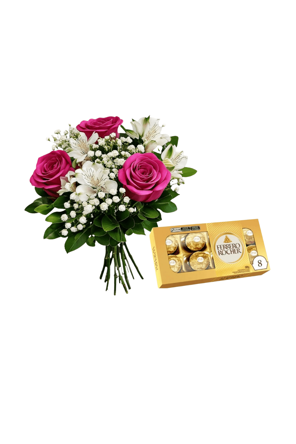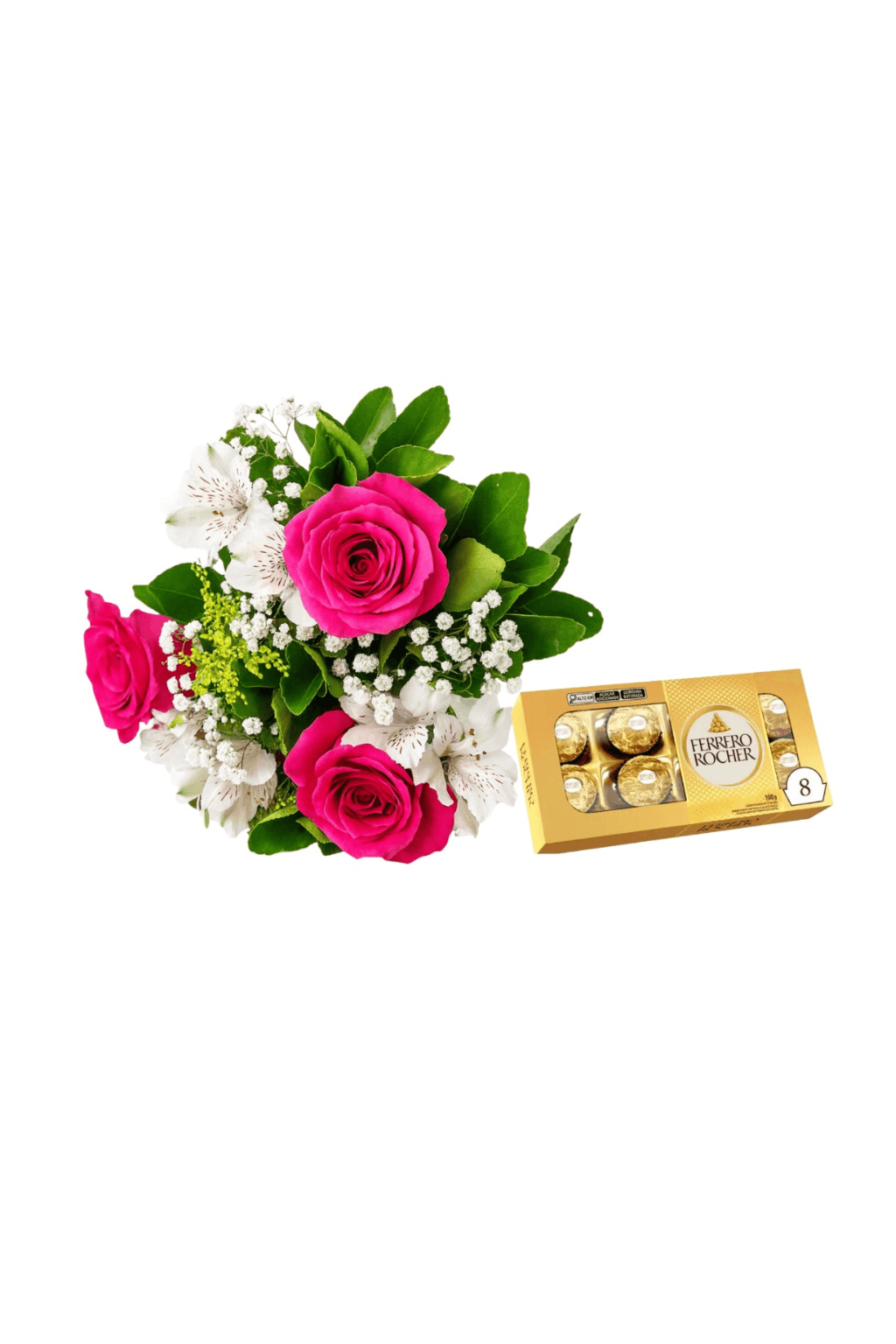 Procurando por um kit especial? Esse combo de Buquê de 3 Rosas Importadas Pink Completo e Chocolate Ferrero Rocher 8 Unidades é ideal para surpreender pessoas que amam flores, e que também não abrem mão de um bom chocolate. Ele(a) vai amar! Para completar a alegria, as rosas são importadas, o que faz as rosas durarem muito mais!