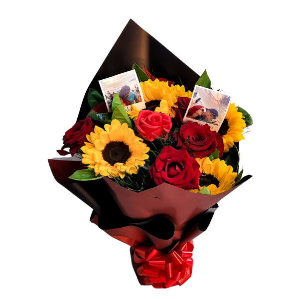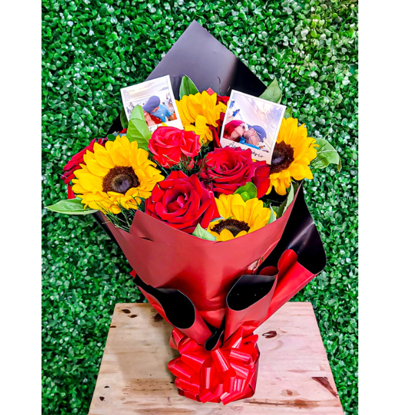 Este lindo buquê de rosas vermelhas e girassóis é um verdadeiro arraso! Além de lindo, esse presente possui um detalhe muito especial, uma das rosas é artificial, ou seja, não morrerá, e o significado desse buquê é demonstrar que você amará essa pessoa para todo sempre.