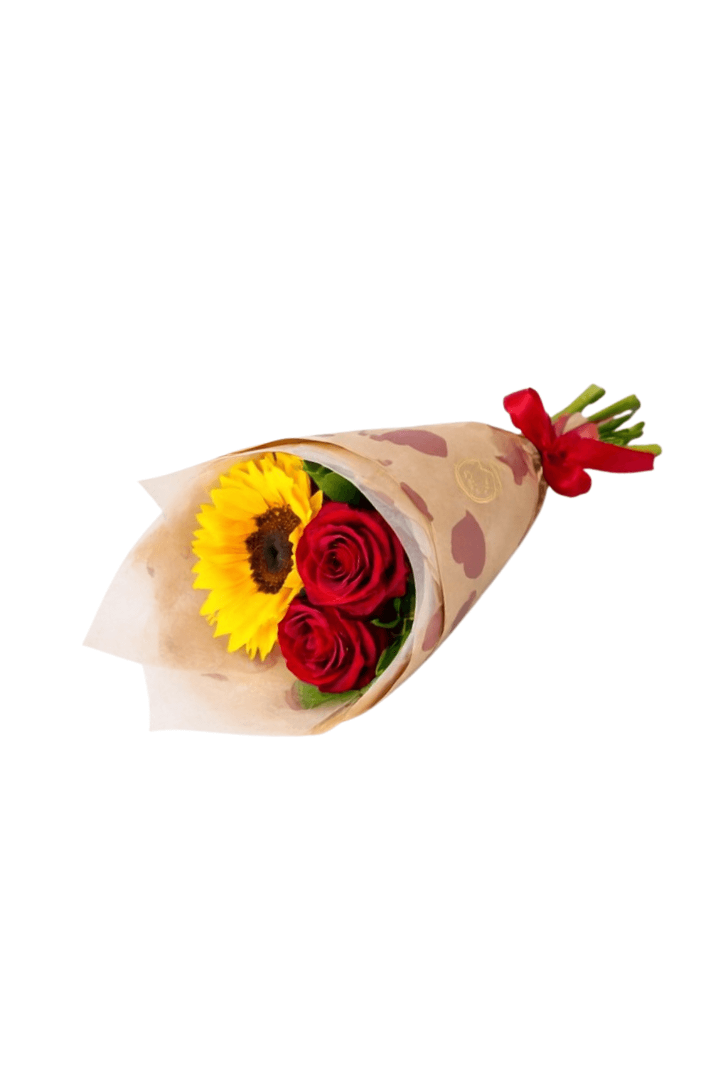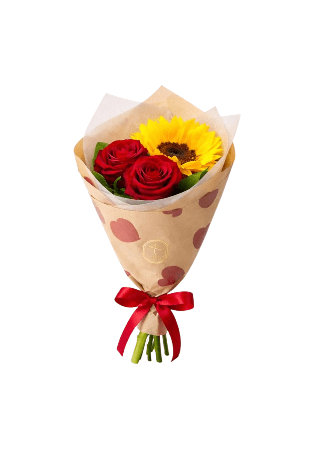 Buquê de 1 Girassol + 2 Rosas Vermelhas