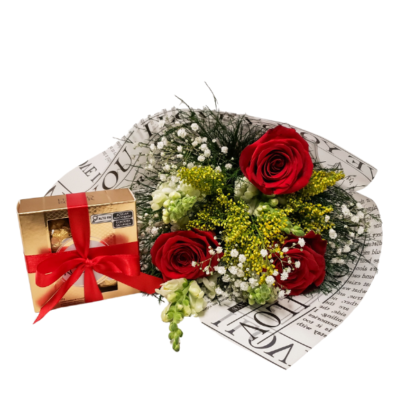 Kit Buquê de 3 Rosas Completo + Ferrero de 4 Unidades
