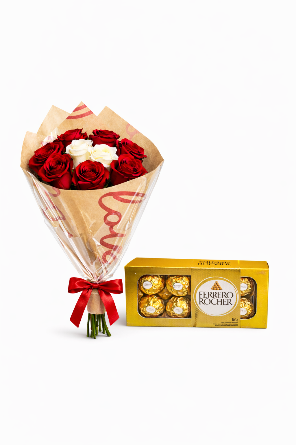 Buquê de 7 Rosas Vermelhas e 2 Brancas + Ferrero Rocher 8 unidades 100g