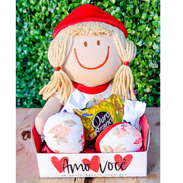 A nossa cesta com boneca de pano + chocolates é a opção ideal quando você quer presentear com alegria e deliciosos chocolates. Ela vai amar.