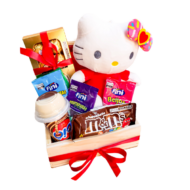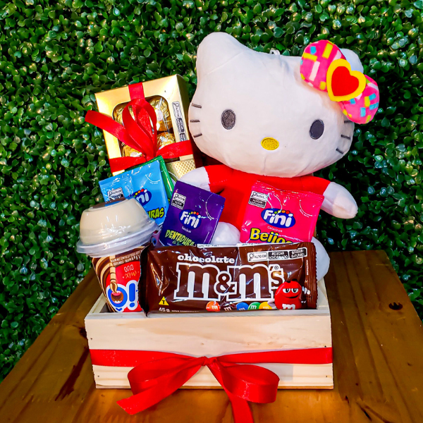 A nossa cesta de chocolate com pelúcia Hello Kit é a surpresa ideal para emocionar e alegrar o dia de alguém especial. Essa cesta vem chocolates e doces deliciosos, acompanhados dessa pelúcia super fofa.