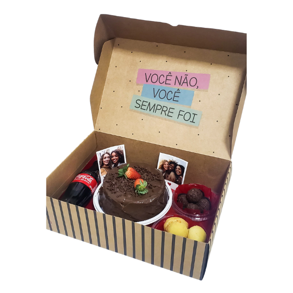 A Festa na Caixa Amizade é tudo o que você precisa para uma comemoração inesquecível! Dentro dessa caixa, você encontrará um delicioso bolo, brigadeiros irresistíveis, salgados fritos crocantes e um refrigerante para completar a festa. E para eternizar o momento, duas fotos polaroid para guardar de lembrança.
