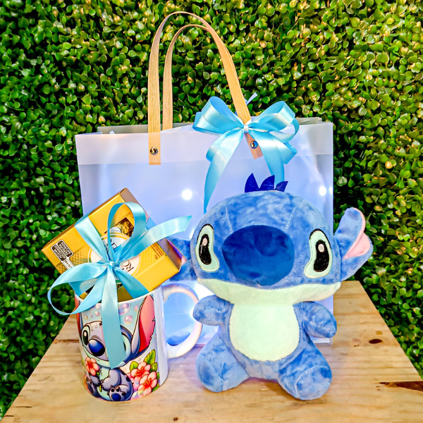 Um kit de presente perfeito para presentear quem você ama! Um mimo surpreendente com a pelúcia stitch, deliciosos chocolates ferrero, caneca adoravel e uma linda sacolinha reaproveitável com led. Essa é a melhor escolha quando o seu desejo é alegrar e desejar felicidades a alguém querido(a).