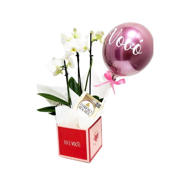 Surpreenda sua querida vovó com esse presente encantador: Cachepôt elegante com uma bela orquídea, acompanhado de uma deliciosa barra de ferrero rocher e um balão personalizado que diz “vovó”. É uma combinação perfeita de beleza, sabor e carinho que vai encher o coração dela de alegria.
