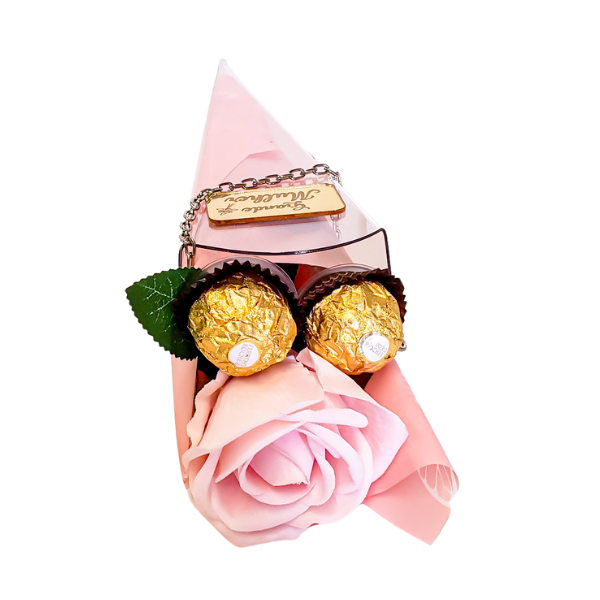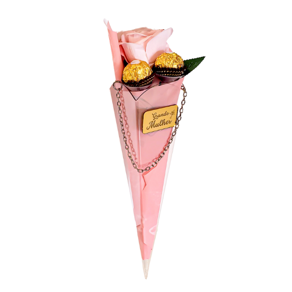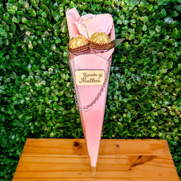 Rosa Unitária na cor Rosa com 2 Ferrero no Cone de Acrílico