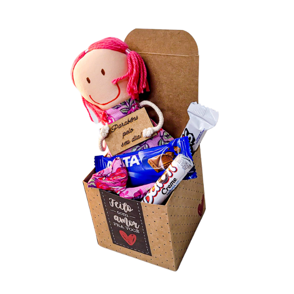 A nossa surpresa na caixa com boneca de pano + chocolates é a opção ideal quando você quer presentear com alegria e deliciosos chocolates. Ela vai amar.